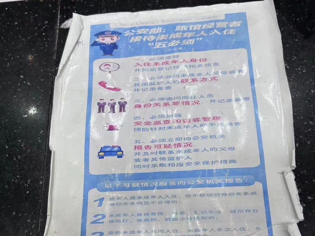 检察干警在公安民警的配合下,重点核查了县域内酒店、宾馆的入住登记台账,了解落实未成年人入住登记制度,以及未成年人入住“五必须”等情况。经查,大部分宾馆从业人员能够按规定落实未成年人入住登记制度,但部分宾馆仍存在未在显眼位置张贴“五必须”宣传标语、宾馆从业人员对强制报告及《中华人民共和国未成年人保护法》有关规定不够了解的现象。活动过程中,公安机关干警对未严格落实未成年人入住相关制度的宾馆、酒店,现场进行了纠正。检察干警对宾馆酒店从业人员发放了未成年保护、强制报告制度方面的宣传手册,宣传落实强制报告制度和未成年保护的重要意义。