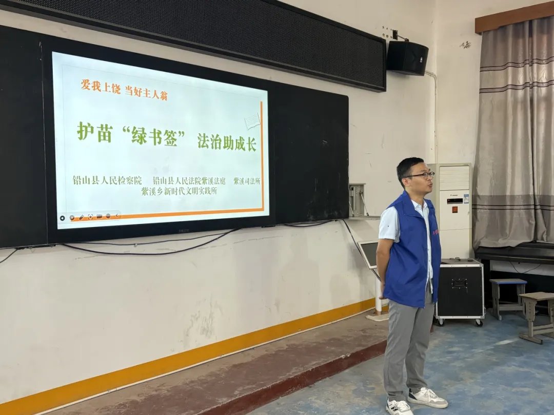 铅山县人民检察院联合铅山县人民法院紫溪法庭、紫溪司法所、紫溪乡新时代文明实践所组织宣讲团分别走进紫溪小学、紫溪中学开展“护苗“绿书签” 法治助成长“主题法治教育。检察官紧密结合《中华人民共和国未成年人保护法》《中华人民共和国预防未成年人犯罪法》等相关法律法规,依托自身的办案经历与真实案例,通过互动问答、以案释法等生动形式,深入浅出地讲解法律知识,引导学生认识到违法犯罪的严重后果,切实增强辨别是非、自我防范与依法维权的能力。