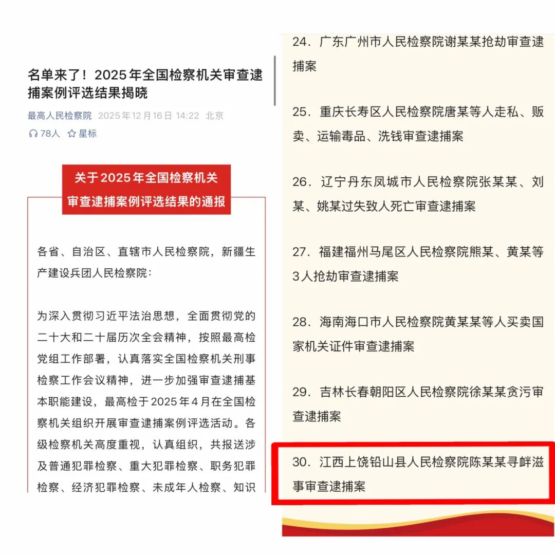 紧扣社会关切,聚焦民生福祉,办理的多个案事例成为法治进步的生动注脚。2025年,我院办理的多起案事例获上级检察机关及相关部门表彰推广:1件案件入选“全国检察机关审查逮捕优秀案例”,1件案件入选“省检察院参考性案例”,1件案事例获评“全省典型案事例”。其中,办理的余某英刑事申诉信访案件通过“检察听证+社会治理”模式,有效化解社会矛盾,相关经验在全省检察机关听证员培训会上作典型发言,为提升检察听证质效提供“铅山样本”。此外,我院撰写的2篇理论调研文章在第二十一届全省检察理论研究年会上分别荣获一、二等奖,实现“办案+调研”双提升。