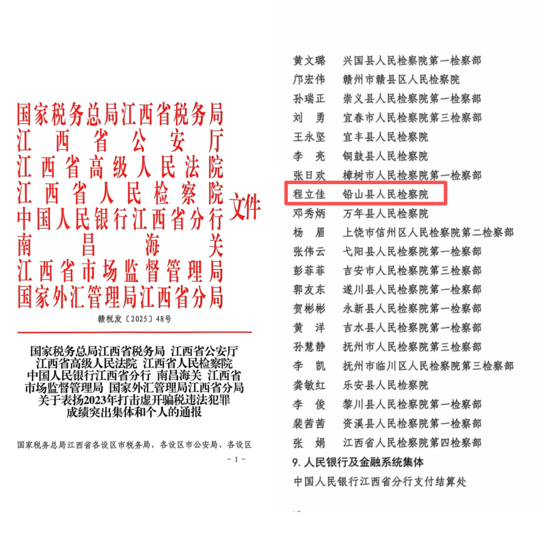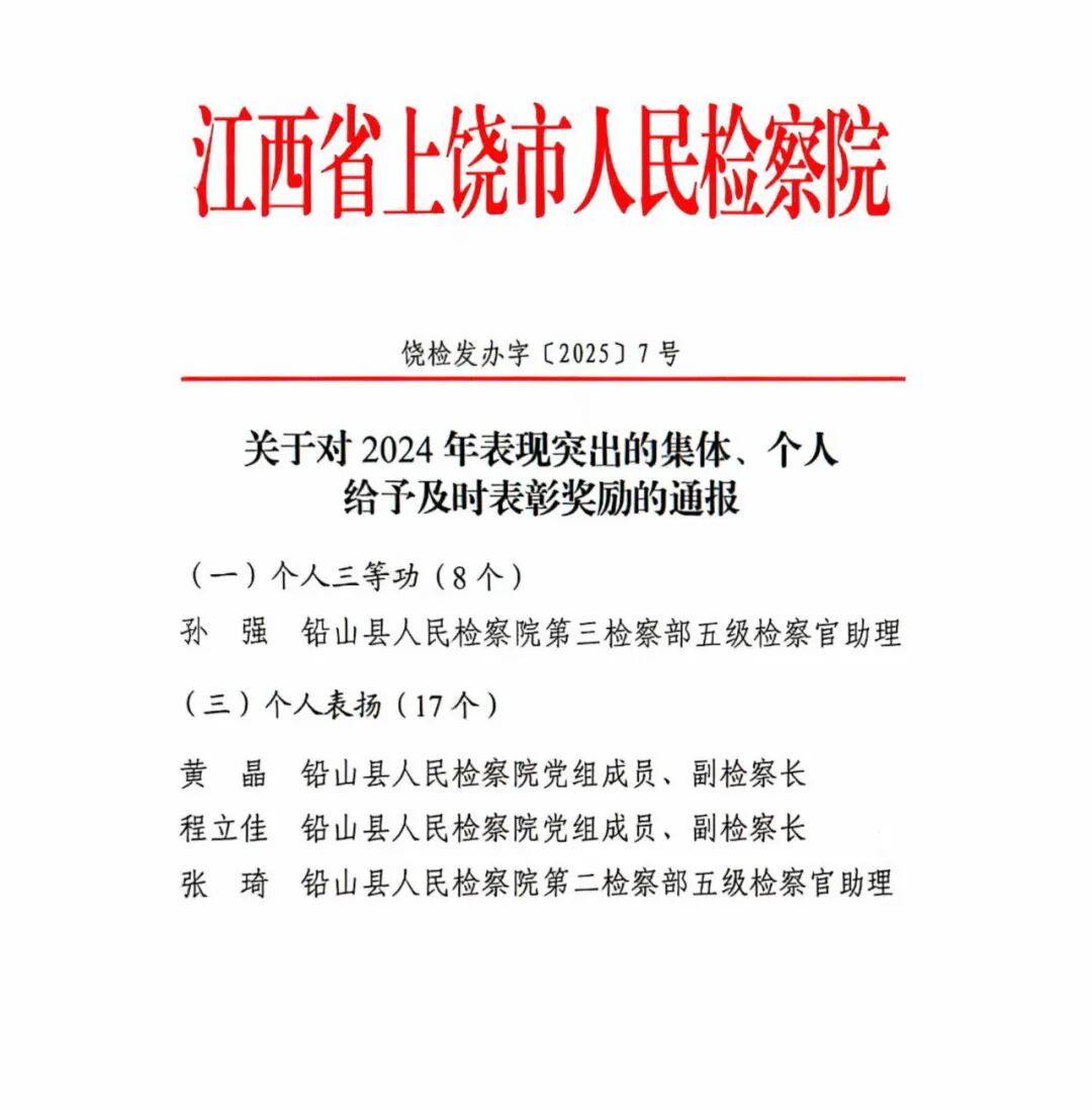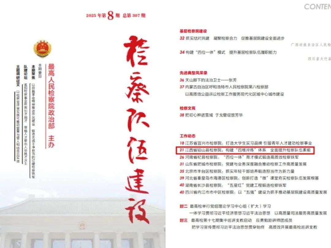 坚持党对检察工作的绝对领导,深化“党建红+检察蓝”品牌建设,打造“学习型+实干型”检察队伍。2025年,我院队伍建设经验做法获最高检《检察队伍建设》专刊刊发,为全国检察机关提供可复制、可推广的“铅山经验”。同时,全院上下形成“比学赶超”浓厚氛围,多名干警在各级表彰中脱颖而出:1名干警因在打击虚开骗税违法犯罪工作中成绩突出,被省级多部门联合表彰,1名干警荣立个人三等功,4名干警获得个人表扬,2名干警获得点名表扬。荣誉的背后,是全院以政治建设为统领、以素能提升为抓手、以争先创优为目标的生动实践。