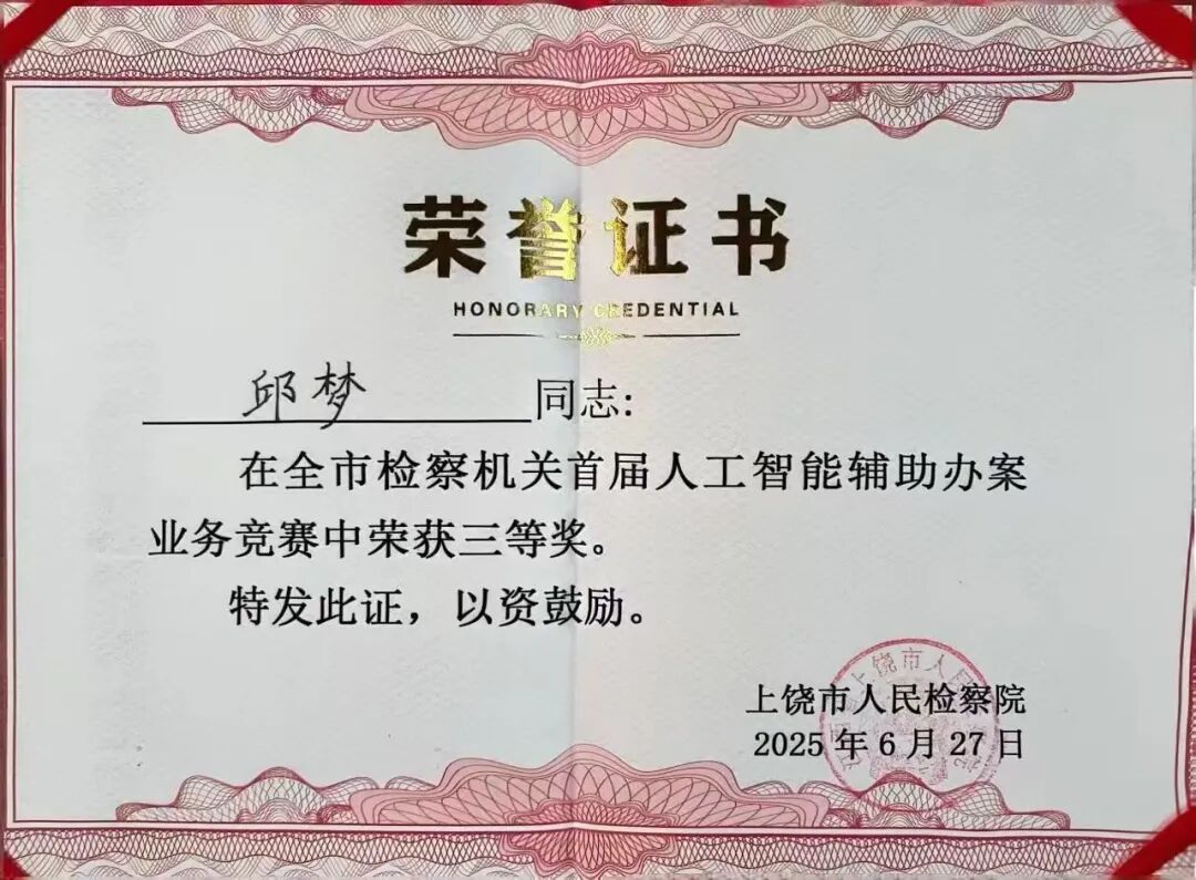 ——坚持“以赛代训”培养模式。3名干警在全市检察业务竞赛中脱颖而出,分别斩获检察侦查“业务能手”、人工智能辅助办案竞赛三等奖、优秀公诉人“全市公诉能手”等荣誉称号。