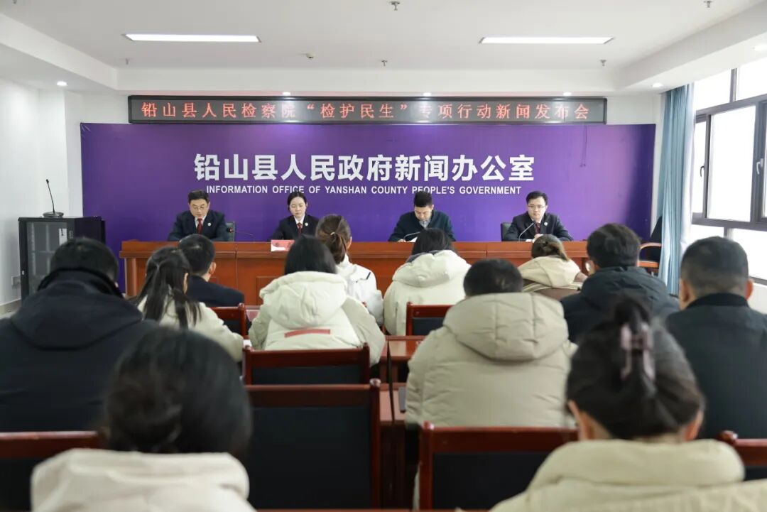 12月27日下午,铅山县人民检察院召开“检护民生”专题新闻发布会,通报了该院积极开展“检护民生”专题活动的工作成效以及办案故事,并回答记者提问。铅山县人民检察院党组成员、副检察长黄晶、第二检察部主任罗翔出席新闻发布会。新闻发布会由县委宣传部副部长邱贞清主持。