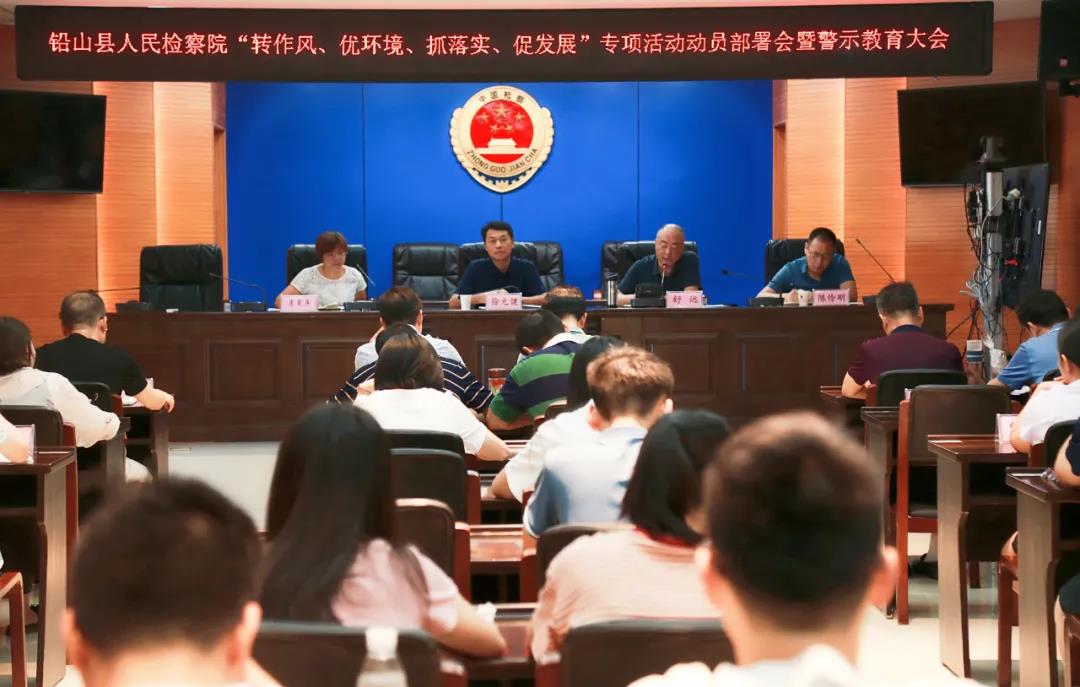 为进一步解放思想,提振检察干警干事创业精气神,根据县委统一部署安排,近日,铅山县人民检察院召开了“转作风、优环境、抓落实、促发展”专项活动动员部署暨警示教育大会。县检察院党组书记、检察长徐元健同志出席会议并讲话,党组副书记、副检察长舒远主持会议,县纪委监委派驻县委政法委机关纪检监察组组长李曼萍到会指导,县检察院全体干警参加会议。