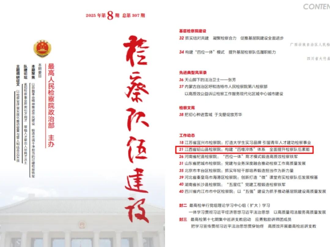 近日,铅山县人民检察院队伍建设经验材料《构建“四维淬炼”体系 全面提升检察队伍素能》,被最高人民检察院政治部主办的《检察队伍建设》2025第8期(总第307期)刊发。